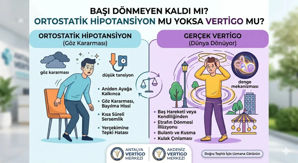 | Semptom | Ortostatik Hipotansiyon | Vertigo (Vestibüler Sorun) |